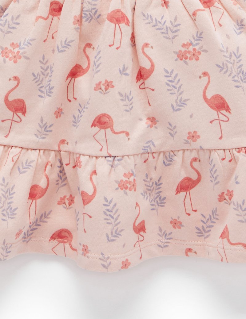 This adorable sleeveless dress features flamingos in a soft watercolour print. Made from 100% GOTS Certified Organic Cotton, the soft, stretchy, unbrushed fleece is gentle on delicate skin and comfortable for all-day adventures. The gathered tiered skirt adds a touch of whim and allows for easy movement, making this dress a summertime favourite for baby girls.