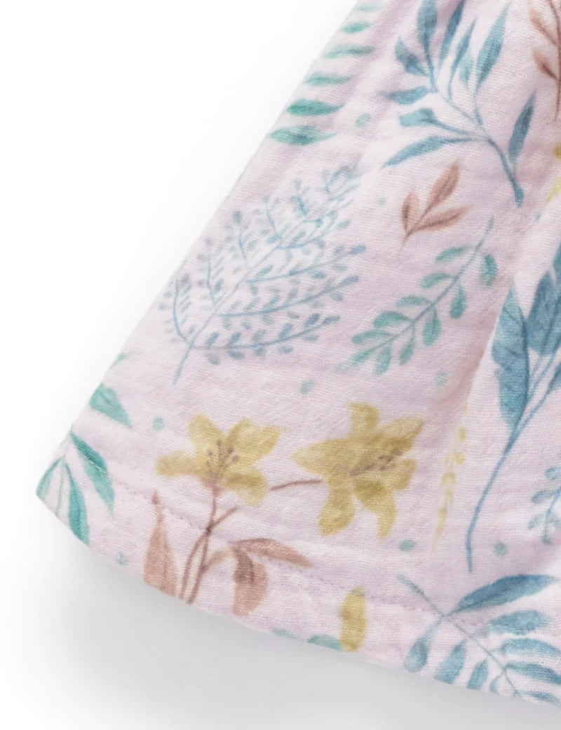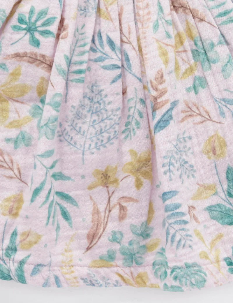 Our Rainforest Tie Shoulder Dress is perfect for those sunny summer days! Featuring pretty bows stitched at the shoulders straps, shirred back yoke detailing and an all over tropical leaf print. Made from our GOTS certified 100% Organic Crinkled Cotton, this dress is soft and breathable for those warmer days. This is a pull on style, so no fussy buttons or zips.